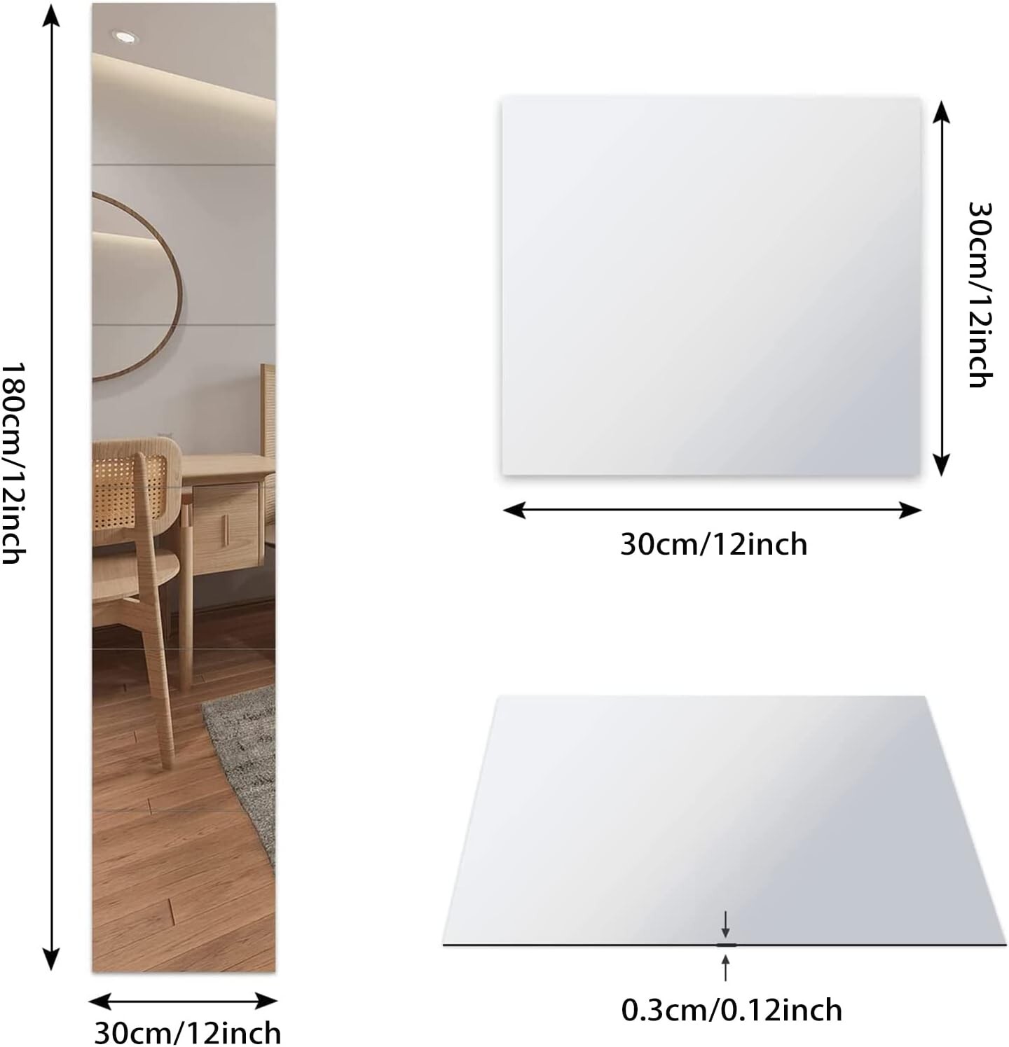 Our long self adhesive wall sticker mirrors are made of high-quality glass material with a smooth surface, ensuring a perfect reflection and long-lasting durability. Unlike acrylic mirrors, these glass mirrors offer a high-definition image. The frameless design features polished edges and a matte side, adding a sleek aesthetic without compromising safety.They can replace traditional glass mirrors in bedrooms, living rooms, dressing rooms, kitchens, gyms, offices, and more. Enjoy the convenience and beauty these mirrors bring to any room.